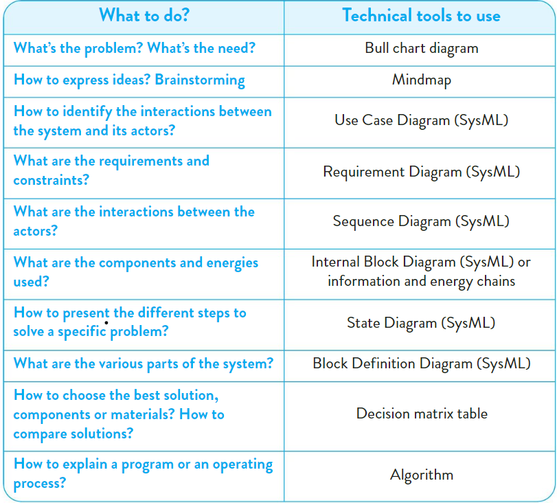 To present your technical project, you need technical tools. You must use the appropriate diagram. The following table helps you to choose which technical tool to use.
